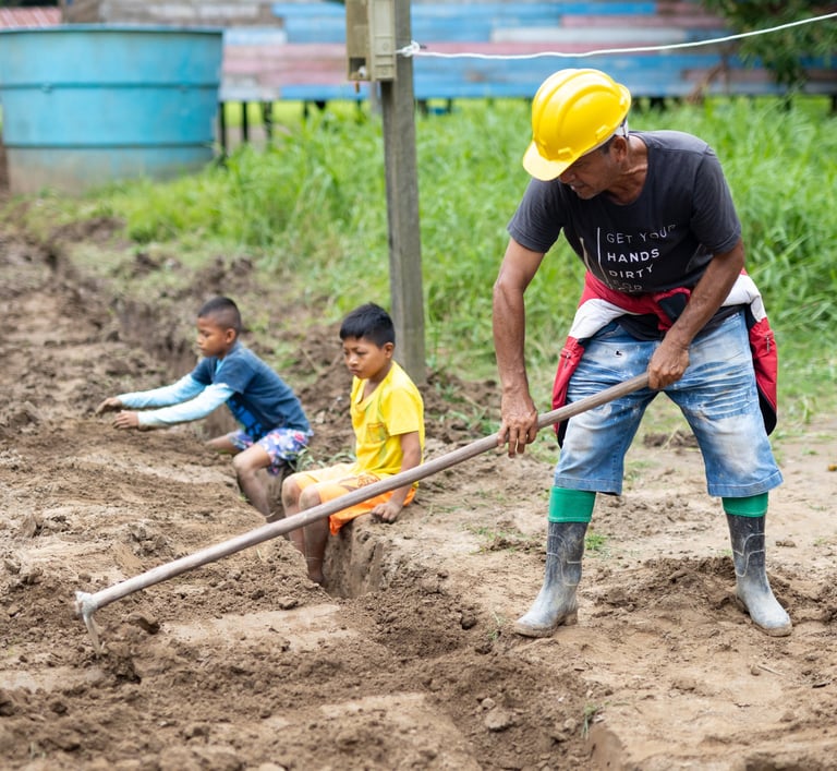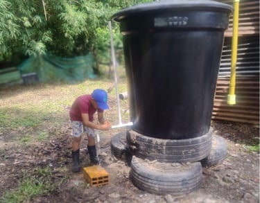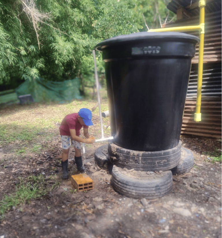El agua de lluvia es una alternativa segura frente al agua superficial o de río, y es abundante en la región. Trabajamos con familias para construir sistemas con tanques de gran capacidad, de manera que puedan contar con suficiente agua sin preocuparse por enfermarse debido a la contaminación.